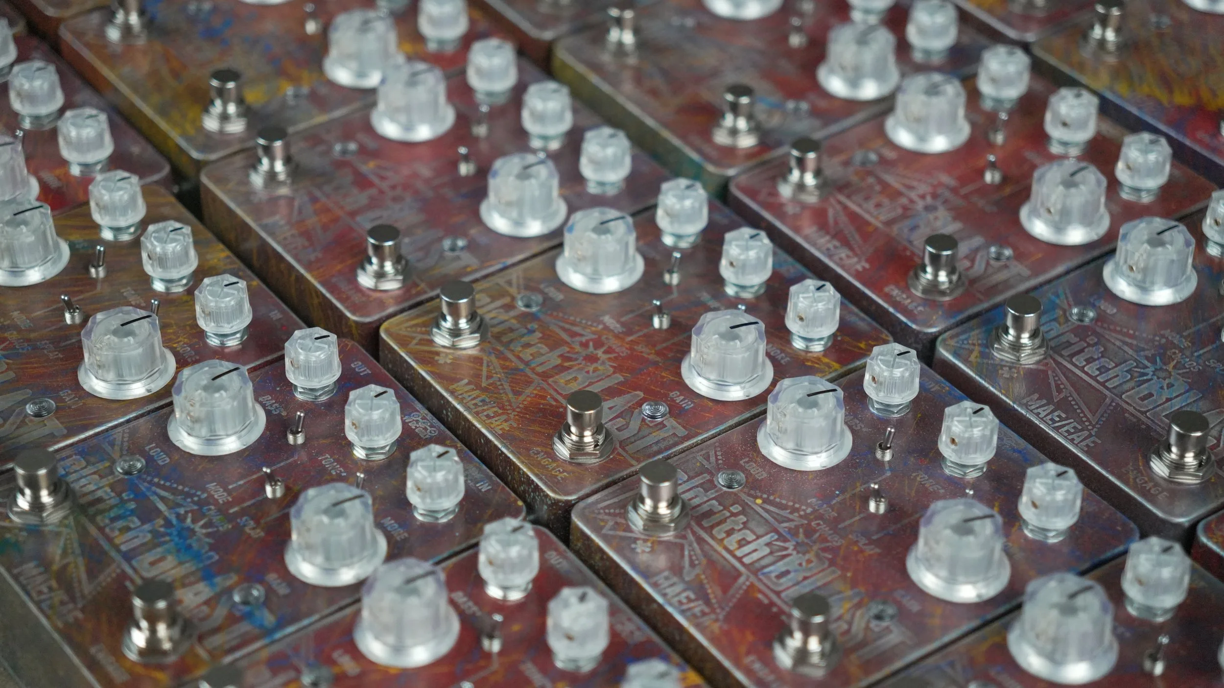 The development of the Eldritch Blast has origins in the early days of EAE. It is a greatly expanded take on the Magic Missile Fuzz, an old design of ours which is an homage to the modern classic fuzzes of Devi Ever, Tim Escobedo, and all of the circuit-bending weirdos on ilovefuzz.com. We teamed up with Alec from Mask Audio Electronics (MAE) to flesh out and fine-tune the design, and together came up with a result which significantly diverged from the original Magic Missile circuit.